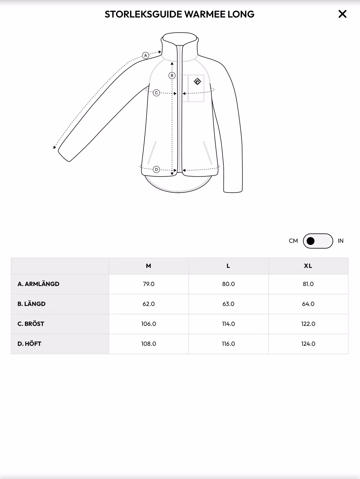 Herremodellen Long av denne jakken tilsvarer en romslig herrestørrelse. I forhold til vår andre WARMEE-modell er denne laget for bedre å passe lengre personer og bredere skuldre. Er du over 180 cm høy, anbefaler vi alltid denne modellen.