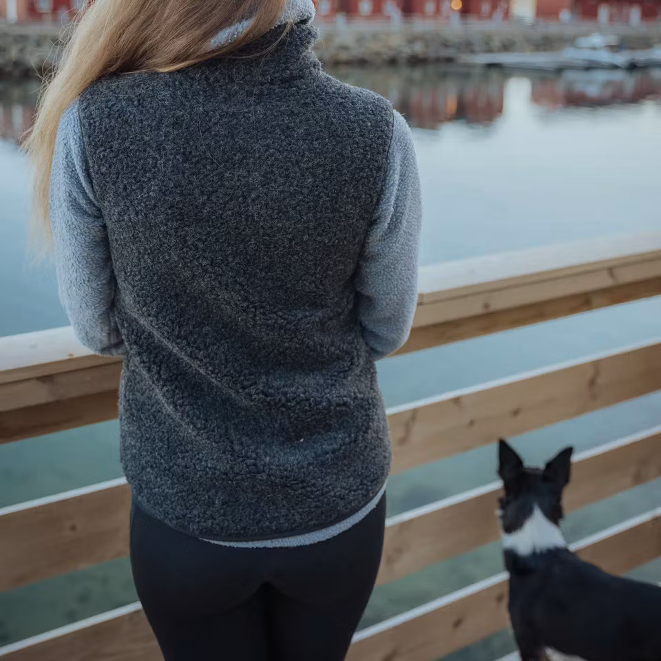 Laget av 100 % tykk merinoull. Modellen har en noe smalere passform enn ulljakken for å passe godt under andre plagg. Med sin 8 cm høye krage og luksuriøse ullmateriale er vesten virkelig deilig å ha på. Vesten har to lommer nederst og en mindre brystlomme på venstre side.
